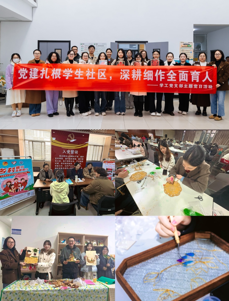 活动以“一站式”学生社区为核心阵地,构建多维度育人体系。在思想教育层面,通过乡村振兴政策深度解读、典型案例分享与实践路径探讨,帮助学生明晰未来发展方向,引导青年将个人发展融入乡村振兴大局,在基层实践中锤炼本领、担当使命;在文化传承方面,支部党员化身“非遗导学”,带领学生系统学习剪纸、宋锦、掐丝珐琅等传统技艺,在裁纸、穿丝、点蓝的手作过程中,推动非遗文化与红色文化深度融合,让优秀传统文化在校园落地生根、薪火相传。