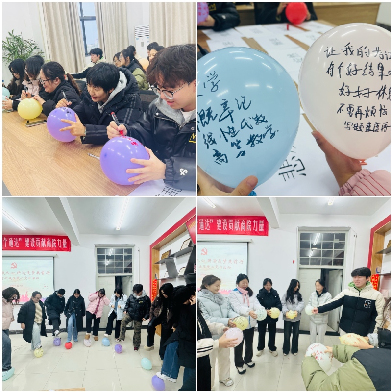 破冰环节聚焦情绪疏导,支部考研学生将备考压力与焦虑尽数落笔于气球之上,伴随齐声励志口号共同踩爆气球,在趣味宣泄中释放考前紧绷的备考压力,轻松卸下心理重担。