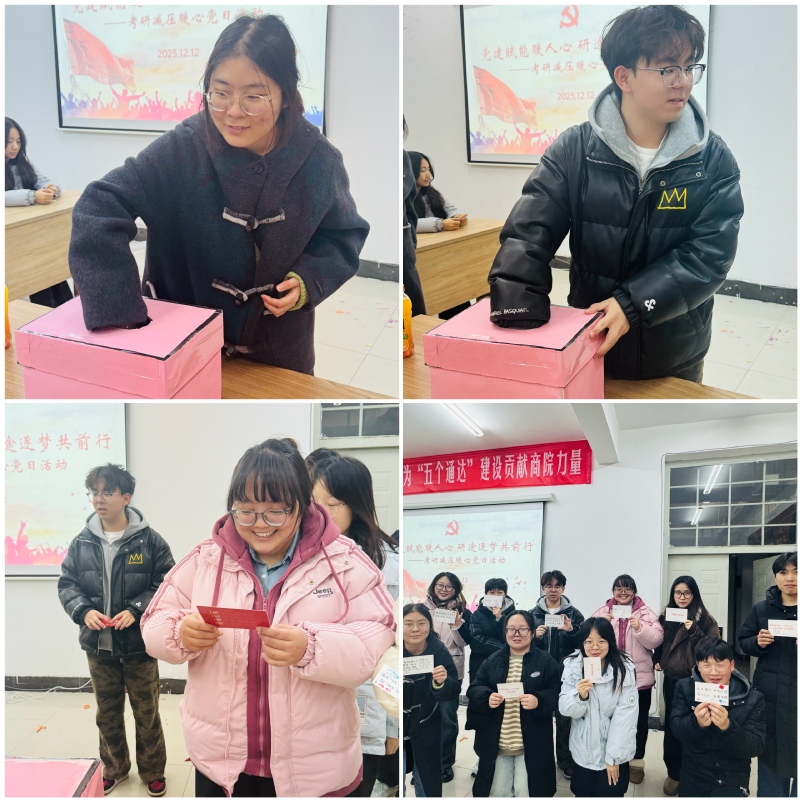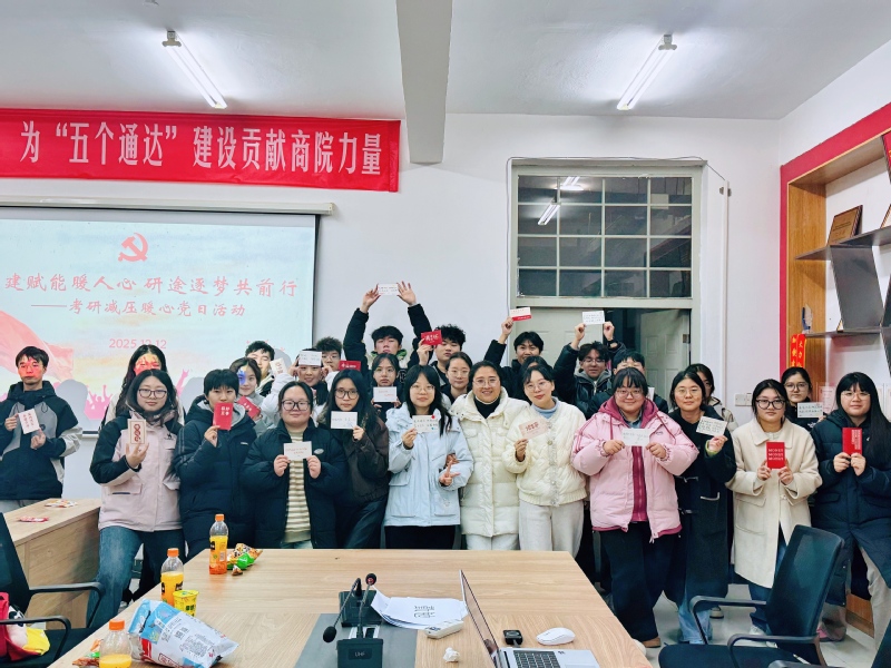 为深化党建引领育人实效,精准缓解考研学生考前焦虑情绪,12月12日下午,商学院学生第一党支部开展考研暖心减压党日活动,支部全体党员及部分入党积极分子全程参与。活动以趣味减压为核心,流程精简高效、氛围温馨,贴合考研学生备考节奏,设置多项沉浸式互动环节,全方位为他们舒缓压力、提振信心。